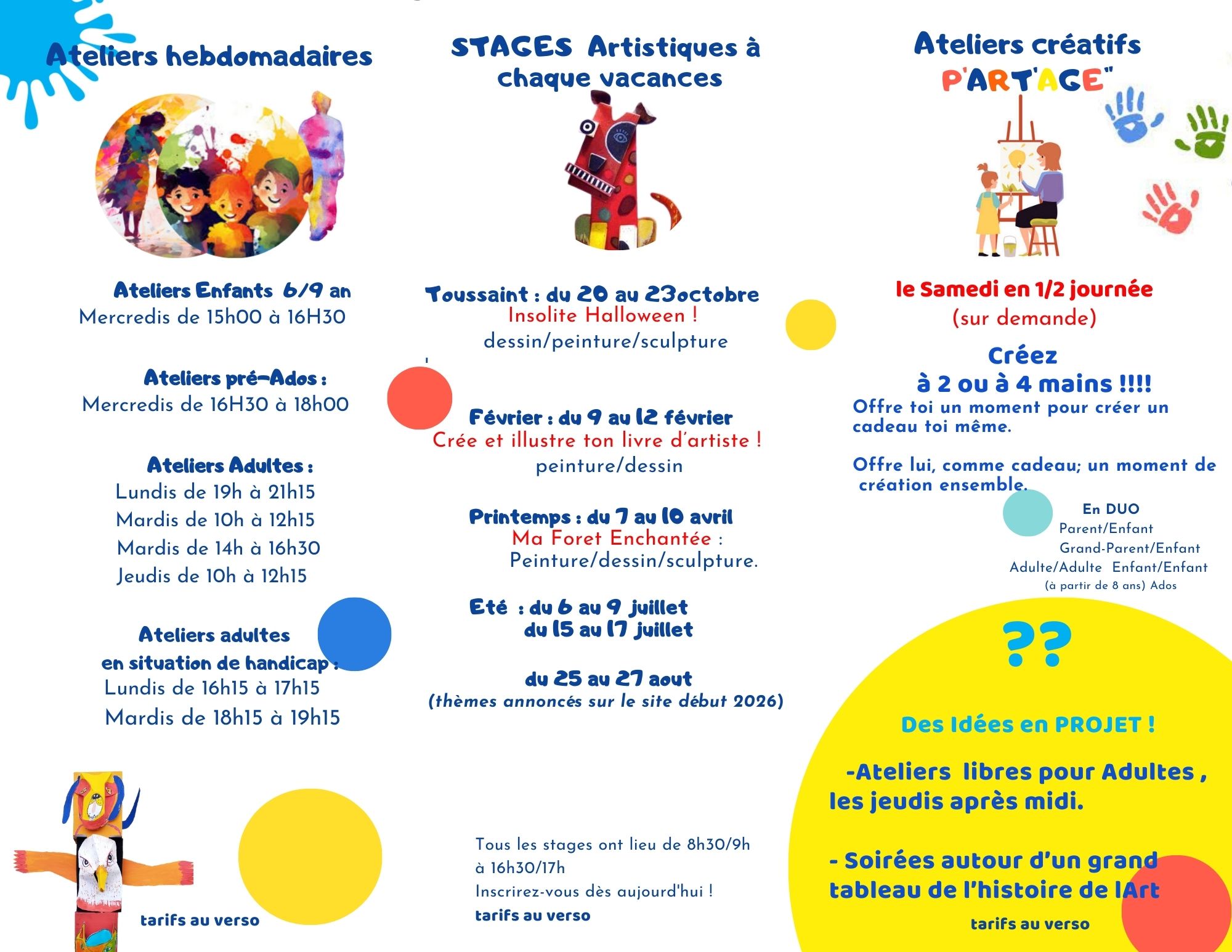 La devise des ateliers est de mener chacun vers plus de créativité et vers sa propre écriture picturale en utilisant les différentes matières comme moyens d’expressions et le dessin pour apprendre « A VOIR « .