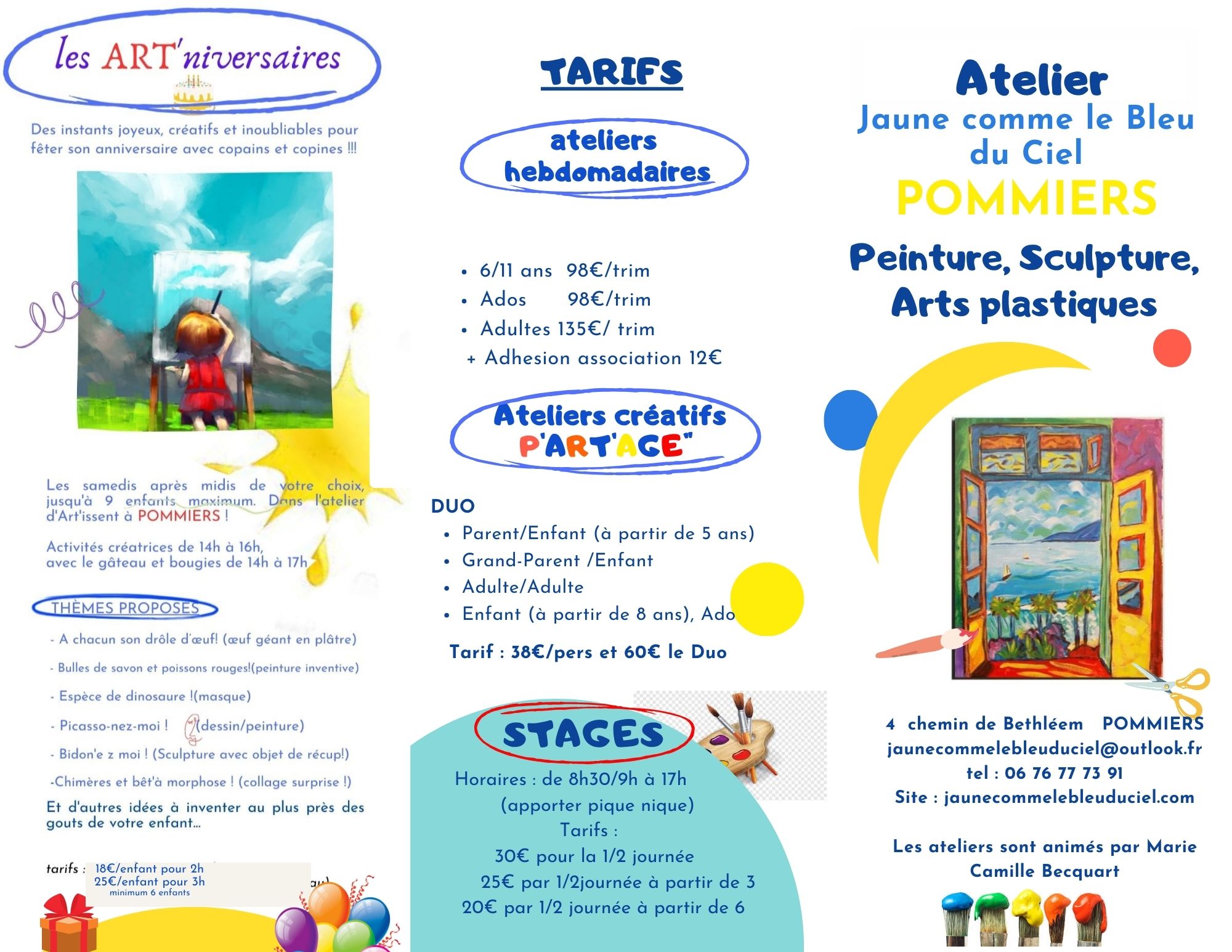 Installée à Pommiers depuis 1998, l’association « Jaune comme le bleu du Ciel » propose divers Ateliers Artistiques, animés par Marie Camille Becquart Motte. L’association accueille chaque année différents publics venus peindre et créer autrement, dans un esprit d’ouverture et de créativité. Marie Camille Becquart Motte intervient aussi à l’extérieur, en institution, en milieu scolaire, en Ehpad, en entreprise…